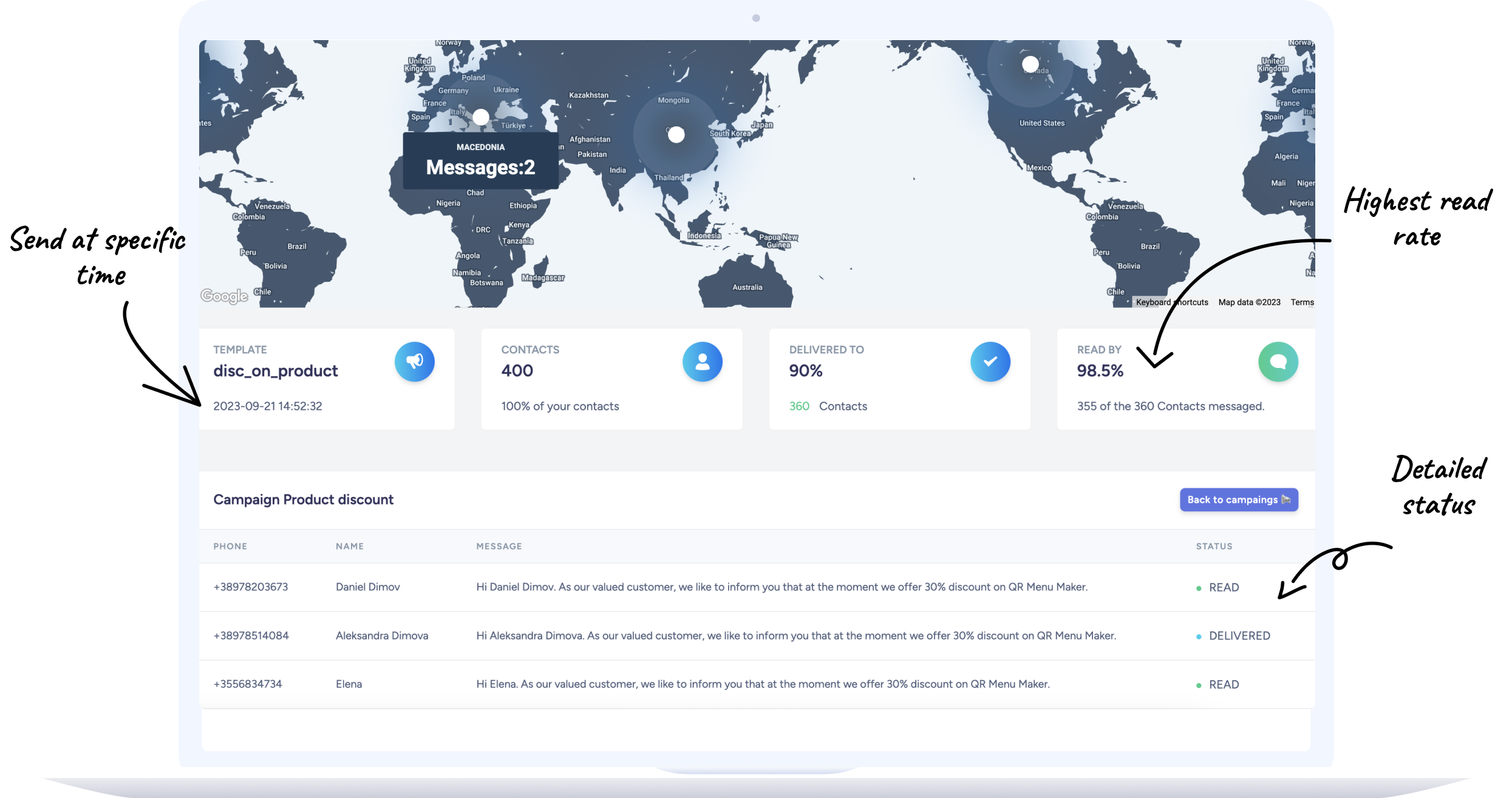 O Marketing do WhatsApp é um novo campo no Marketing Direto. Experimente uma taxa de leitura de cerca de 98% nas suas campanhas e nunca tenha medo de sua conta ser bloqueada pelo WhatsApp.